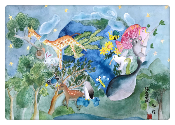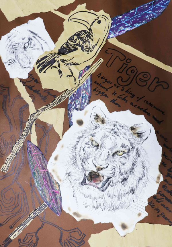 闫平老师点评:画⾯中⼤胆运⽤拼贴的语⾔,包括画⾯中对⽂字符号的使⽤,都是很好的尝试,值得⿎励。⾊彩简洁概括。