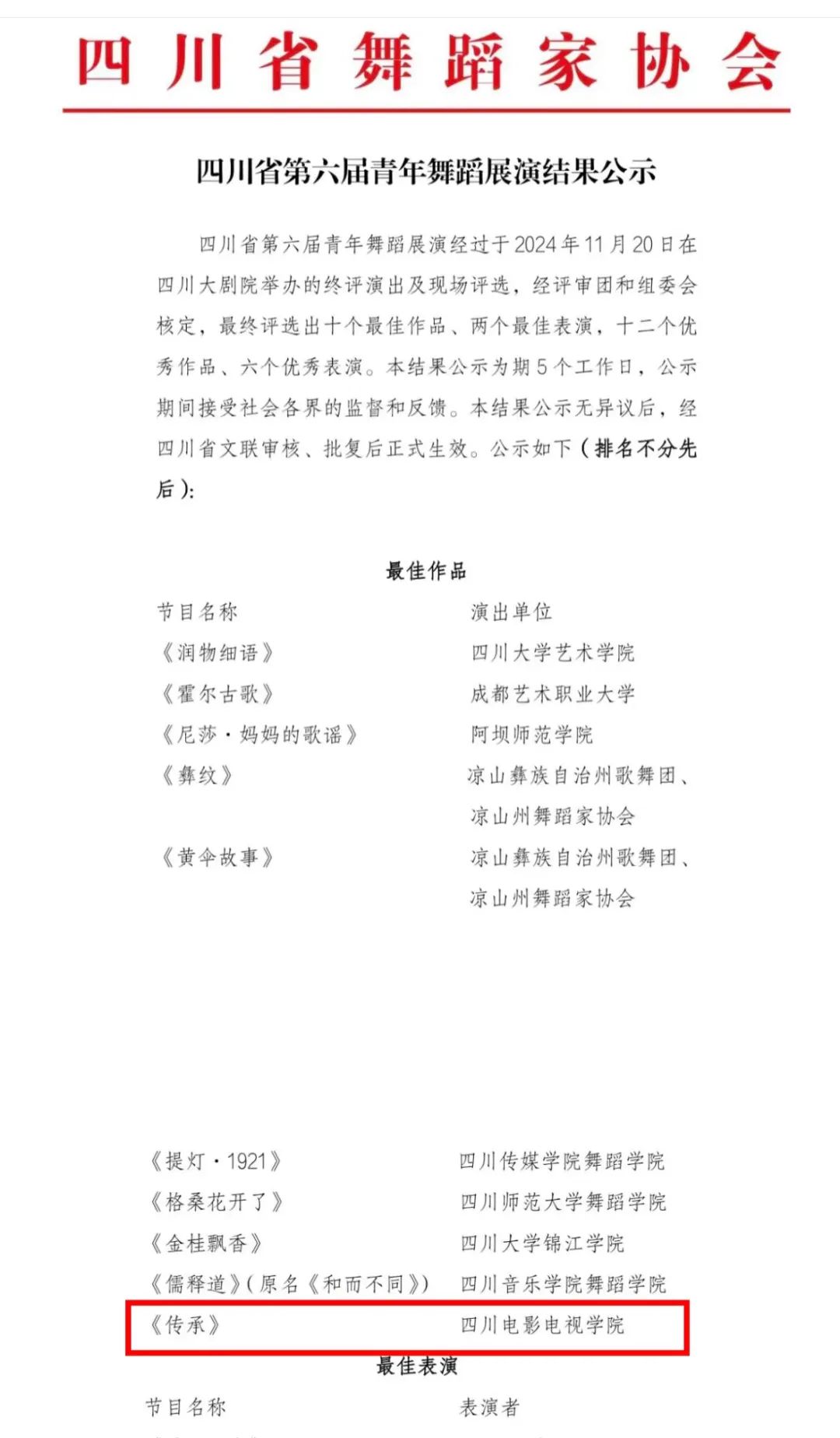 四川电影电视学院舞蹈学院多年来一直致力于培养舞蹈人才和推动舞蹈作品的创新。《传承》在20余部参演作品中突出重围,荣获奖项,这不仅是对我院两位青年教师及学生付出努力的认可,也是对舞蹈学院实力的肯定。我们坚信,四川电影电视学院舞蹈学院将继续创作出更多优秀的舞蹈作品,为观众带来更多美的享受。