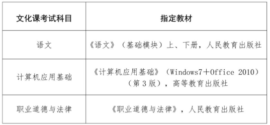 1.文化课考试方式。文化课采取笔试的考试方式,实行全省统一命题、统一考试、统一评卷,由省考试局负责组织实施。考试内容为我省中职学校所开设课程的基本知识,各科指定教材详见下表:
