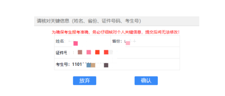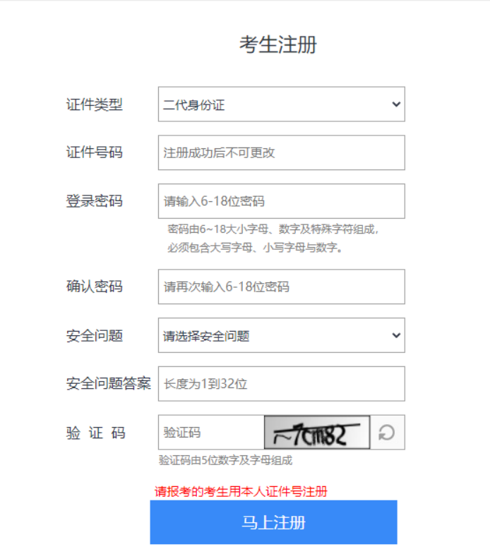 考生须选择自己证件类型、并依次填写本人证件号,填写完登录密码和确认密码后,确认信息无误以后点击【确认】。