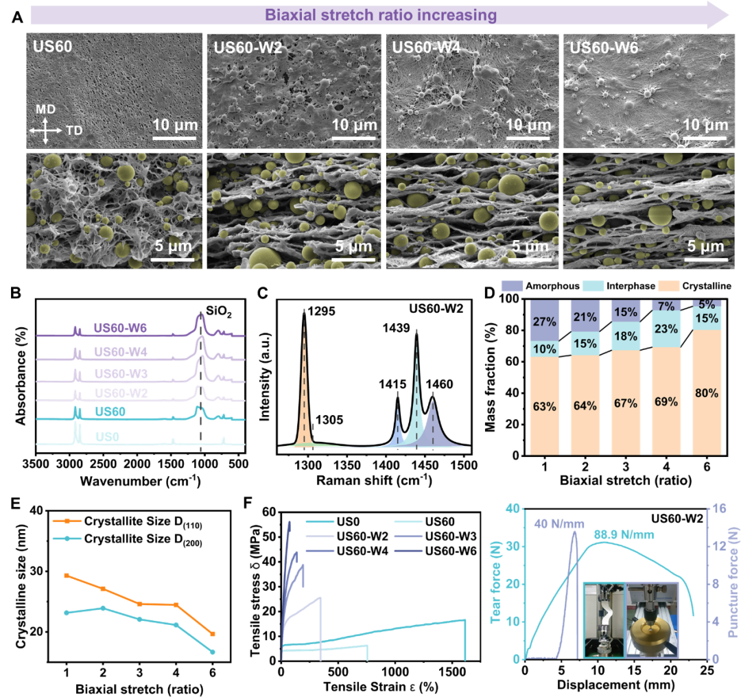 在双向拉伸作用下,UHMWPE的片晶发生显著滑移并逐渐被取向的纤维晶取代,形成交错的网状结构,UHMWPE的结晶度也得到提升。由于SiO2微球的支撑作用,这一过程还伴随着类椭球状的微三明治结构的形成。高度取向的纤维晶和高结晶度显著提升了聚合物多孔膜的力学强度,即使在60wt%的无机颗粒和68%的孔隙率下,多孔膜也表现出优异的机械性能(拉伸强度25 MPa和撕裂强度88.9 N/mm)。