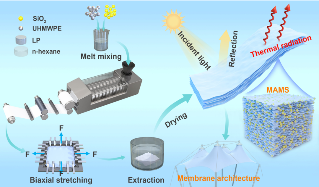 团队在“聚合物(超高分子量聚乙烯,UHMWPE)-致孔剂(液态石蜡,LP)”体系中战略性引入球状无机颗粒(SiO2微球),开发出了一种简单且可连续化的“相分离-双向拉伸”技术,在聚合物膜上创新性地实现了一种微三明治多孔结构(MAMS)。利用UHMWPE分子链高度缠结特性,所形成的紧密聚合物骨架可以有效包裹SiO2微球和LP微滴。其中,SiO2微球在双向拉伸过程中起到关键的支撑作用,使得LP微滴在UHMWPE骨架下挤压下形成椭球状。