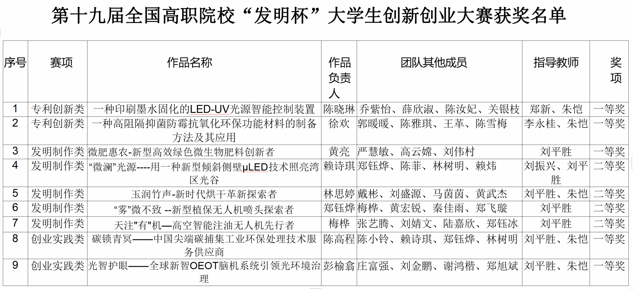 12月22日,第十九届全国高职院校“发明杯”大学生创新创业大赛在山东理工职业学院落下帷幕。我校学生参赛项目在全国高职院校项目中脱颖而出,共获一等奖5项、二等奖4项,获一等奖数目以及获一等奖、二等奖总数均创新高!另外,学校荣获大赛优秀组织奖。