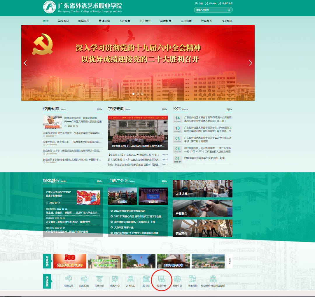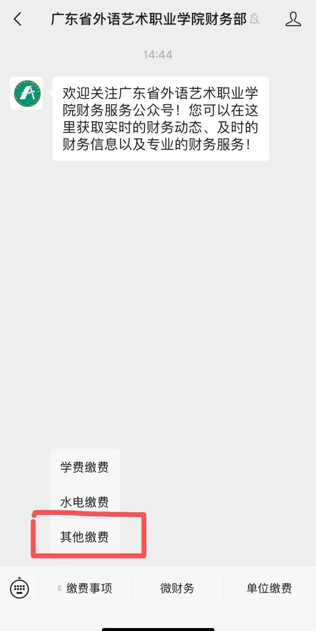 广东省外语艺术职业学院财务处微信公众号缴费(只能微信方式缴费)。