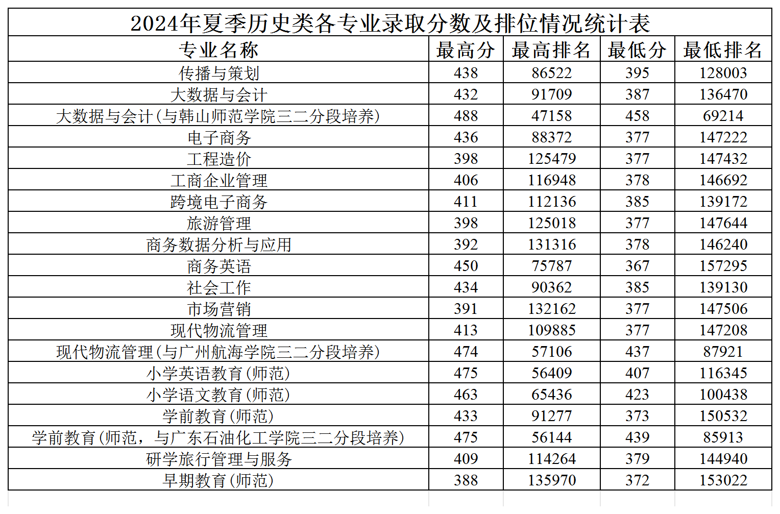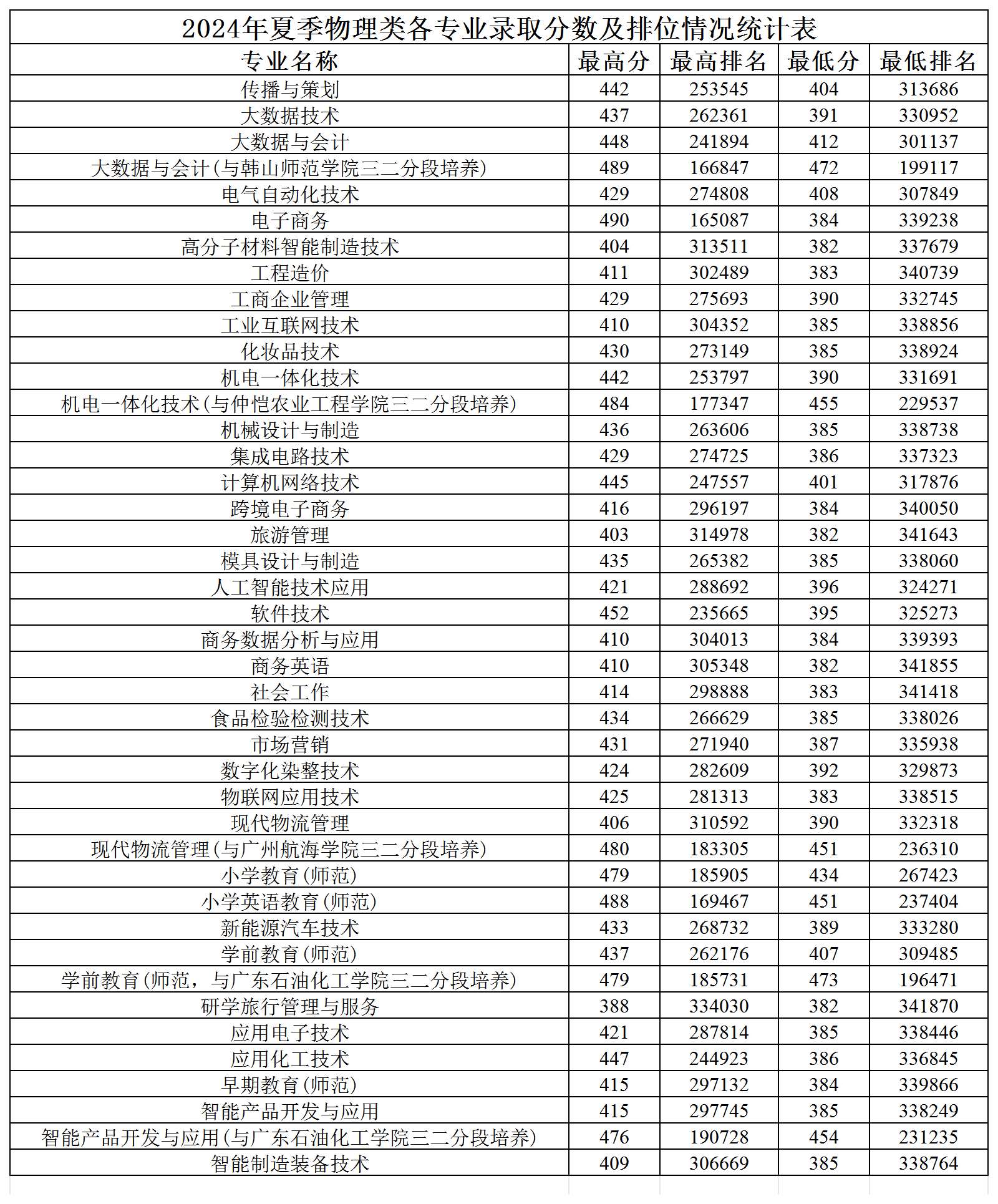 江门职业技术学院2024年省内夏季高考各专业录取分数及排位情况