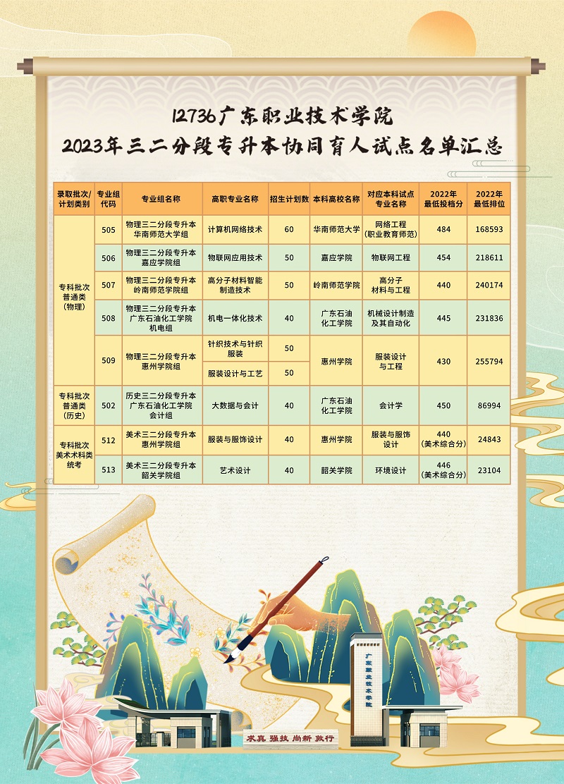 我校省外招生计划详见《广东职业技术学院2023年夏季普通高考省外招生计划发布》三、三二分段专升本协同育人项目专业组介绍