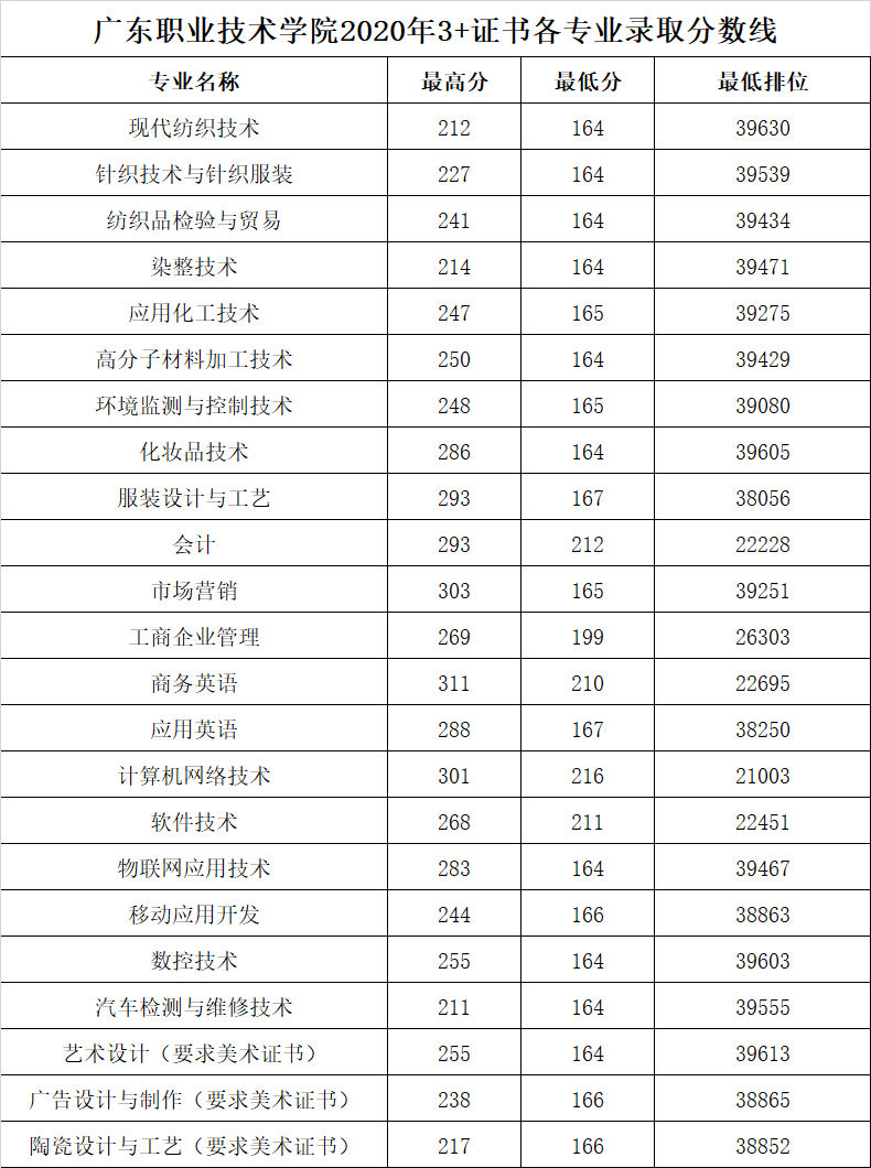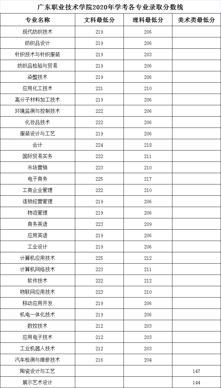 广东职业技术学院2020年学考、3+证书各专业录取分数线