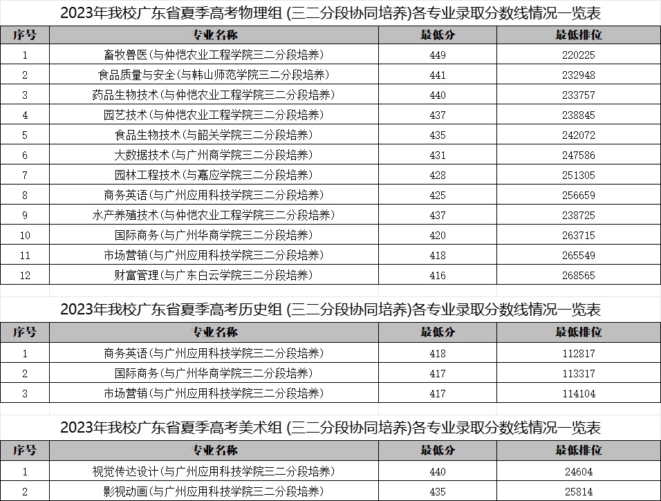 2023年我校广东省夏季高考与本科院校(三二分段协同培养)招生专业录取最低分数线情况一览表