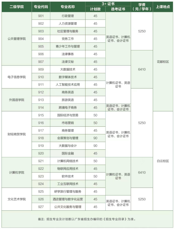 广东行政职业学院2024年春季高考(3+证书类)招生计划一览表