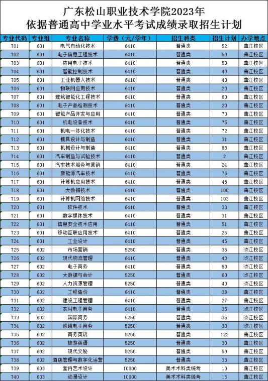 广东松山职业技术学院2023年依据学业水平考试成绩录取招生计划