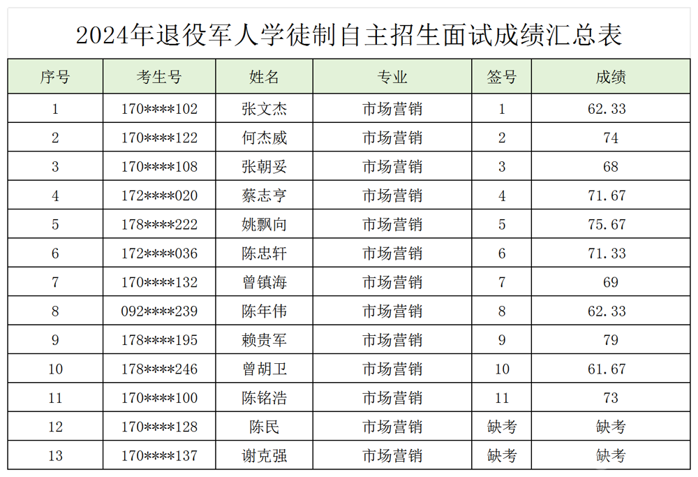 根据《广东省教育厅广东省退役军人事务厅关于做好2024年高等职业院校自主招生工作的通知》(粤教考〔2024〕4号)文件精神,我校于2024年5月18日进行了退役军人现代学徒制专项试点职业技能考核,现对考生的成绩予以公示(见下表)。