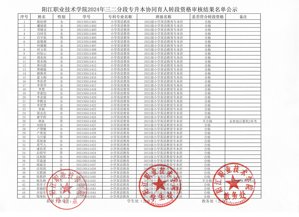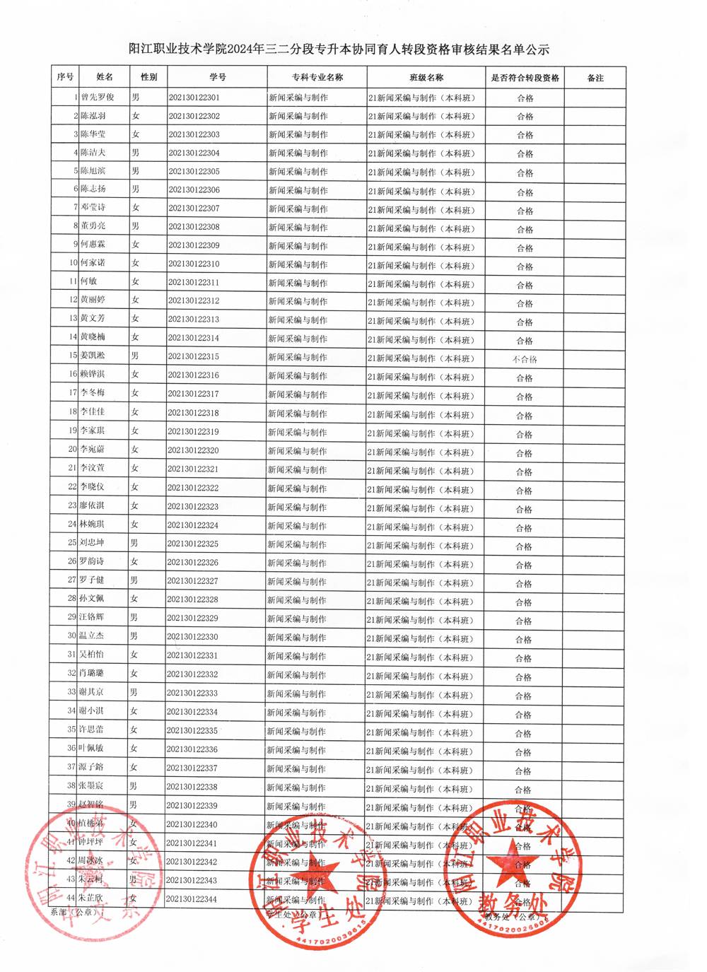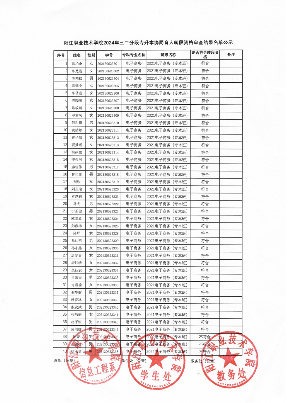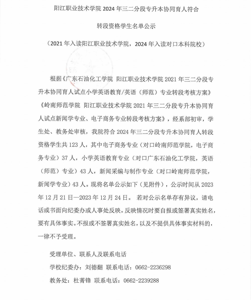 附件:1.电子商务专业符合2024年转段资格学生名单 2.小学英语教育专业符合2024年转段资格学生名单 3.新闻采编与制作专业符合2024年转段资格学生名单 撰稿:教务处招生办 校对:招生办 审核:招生办