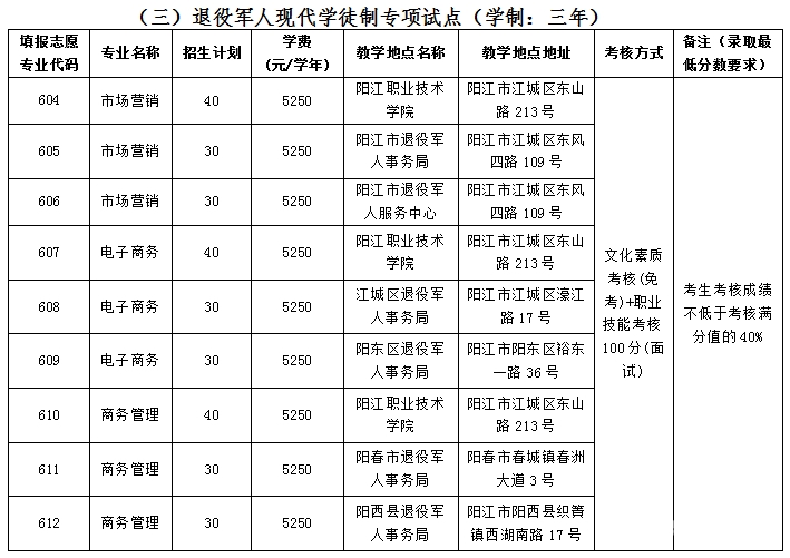 3.退役军人现代学徒制专项试点考生:符合条件的退役军人报考退役军人现代学徒制专项试点计划免文化素质考核,组织实施职业技能考核。职业技能考核满分值100分。拟录取考生的考核成绩不得低于考核满分值的40%,本校依据各教学点各专业的招生计划,根据考生总分由高到低依次录取,在最低录取分数线上录满为止。考生总分相同时,“职业技能考核”成绩高者优先录取。
