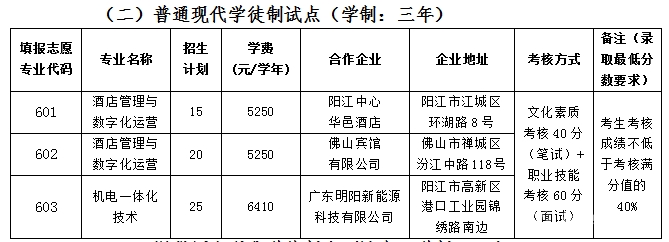 (2)普通现代学徒制试点:考生应为我校招生专业合作企业的在职员工。如考生非试点招生专业合作企业的在职员工,须在录取前与合作企业签订合法的劳动合同。
