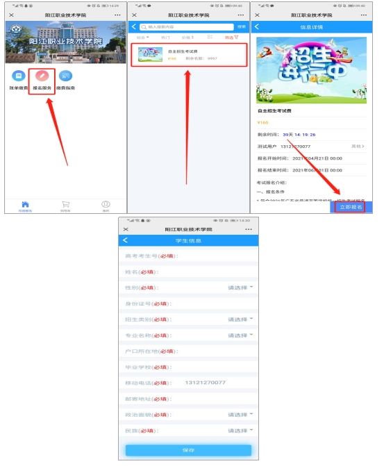 (四)注册完成后进入缴费平台,在主页中点击“报名服务”,选择“自主招生考试费”,点击“立即报名”,填写需报名的学生信息,注意核对所填写的信息。