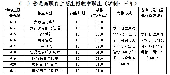 1.普通高职自主招生招收中职生:实行“文化基础+职业技能”的考核方式,文化基础考核包括综合文化知识和专业综合理论。综合文化知识和专业综合理论、职业技能占比例为4:3:3。“文化基础”及“职业技能”测试满分值合计500分,其中综合文化知识考核满分值为200分,专业综合理论考核满分值为150分,职业技能考核满分值为150分。拟录取考生的考核成绩不得低于考核满分值的40%,本校依据各专业的招生计划,根据考生总分由高到低依次录取,在最低录取分数线上录满为止。考生总分相同时,“职业技能考核”成绩高者优先录取。