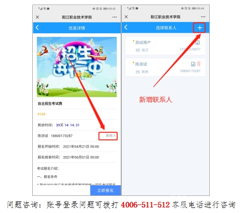 (七)使用本人账号给他人缴费,在报名详情的页面,点击“姓名”、“手机号”右侧的“其他”,然后新增联系人,填写新的联系人信息即可。