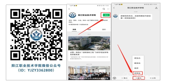 (二)扫描二维码关注阳江职业技术学院公众号“阳江职业技术学院”,或者微信搜索“阳江职业技术学院”公众号;关注公众号后,点击中间菜单“服务”-“财务处”菜单进入智慧财务平台。