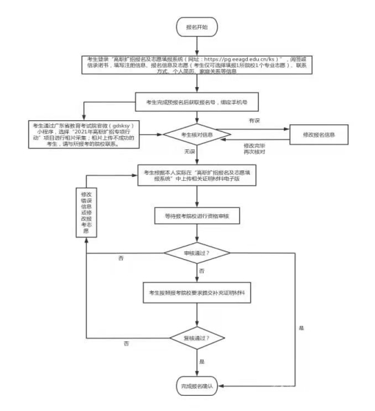 考生登录广东省高职扩招报名及志愿填报系统(https://pg.eeagd.edu.cn/ks),根据系统指引阅签诚信承诺书,填写注册信息、报名信息及志愿信息、联系方式、个人简历、家庭关系等信息,获取报名号、绑定手机号,通过微信小程序采集相片并经核对信息无误后根据实际按照要求上传相关证明材料电子版。高职扩招报名及志愿填报工作全部在网上进行,报名及志愿填报时间为2021年9月22日14:00至9月27日14:00,逾期不再办理相关手续,考生不得再修改已填报个人信息及院校专业志愿。