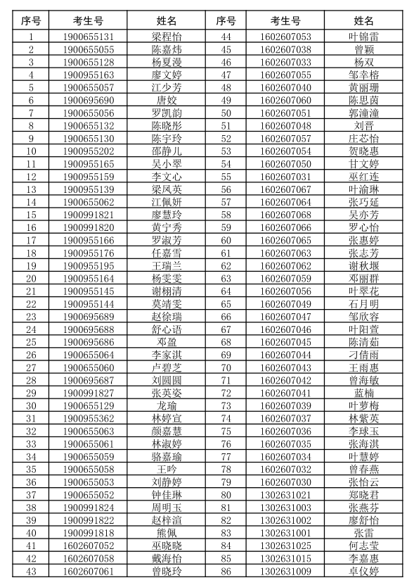 根据《广东省教育厅 广东省招生委员会办公室关于做好2018年职业院校中高职衔接三二分段转段考核工作的通知》粤教职函〔2018〕67号文件精神,经省考试院审核通过,我校2019年中高职衔接三二分段转段录取考生86名,现对录取考生进行公示。