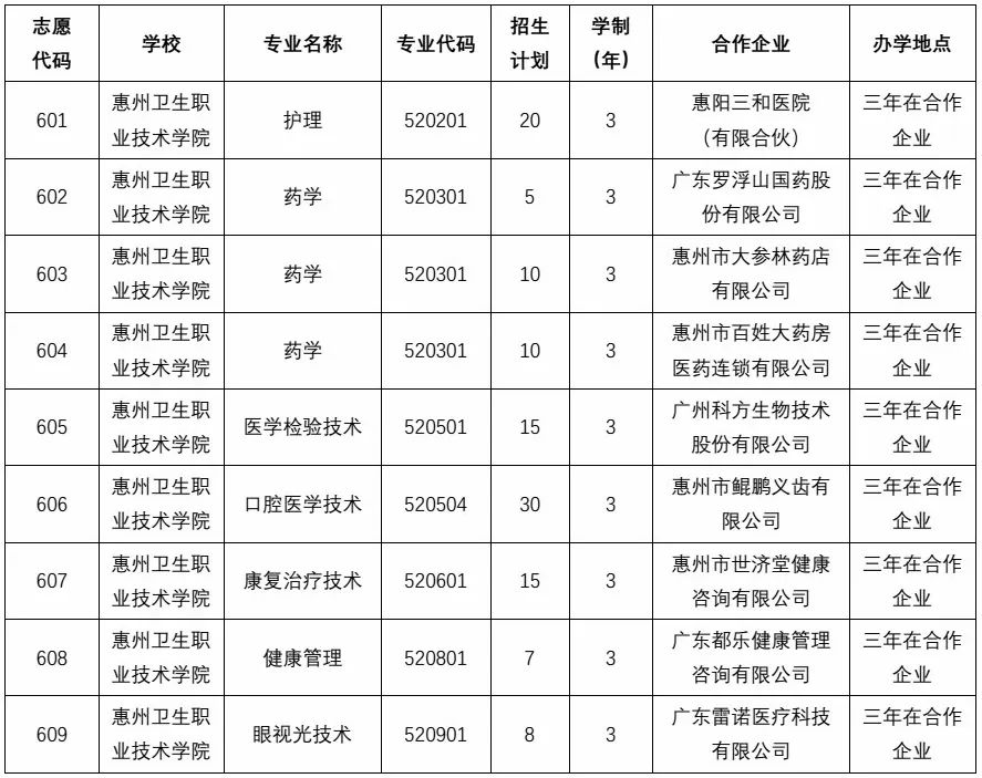 我校2023年自主招生(现代学徒制)试点招生计划为120人,试点专业为眼视光技术、健康管理、口腔医学技术、药学、医学检验技术、护理、康复治疗技术7个专业,试点合作企业为广东雷诺医疗科技有限公司、广东都乐健康管理咨询有限公司、惠州市鲲鹏义齿有限公司、广东罗浮山国药股份有限公司、惠州市大参林药店有限公司、惠州市百姓大药房医药连锁有限公司、广州科方生物技术股份有限公司、惠阳三和医院(有限合伙)、惠州市世济堂健康咨询有限公司。