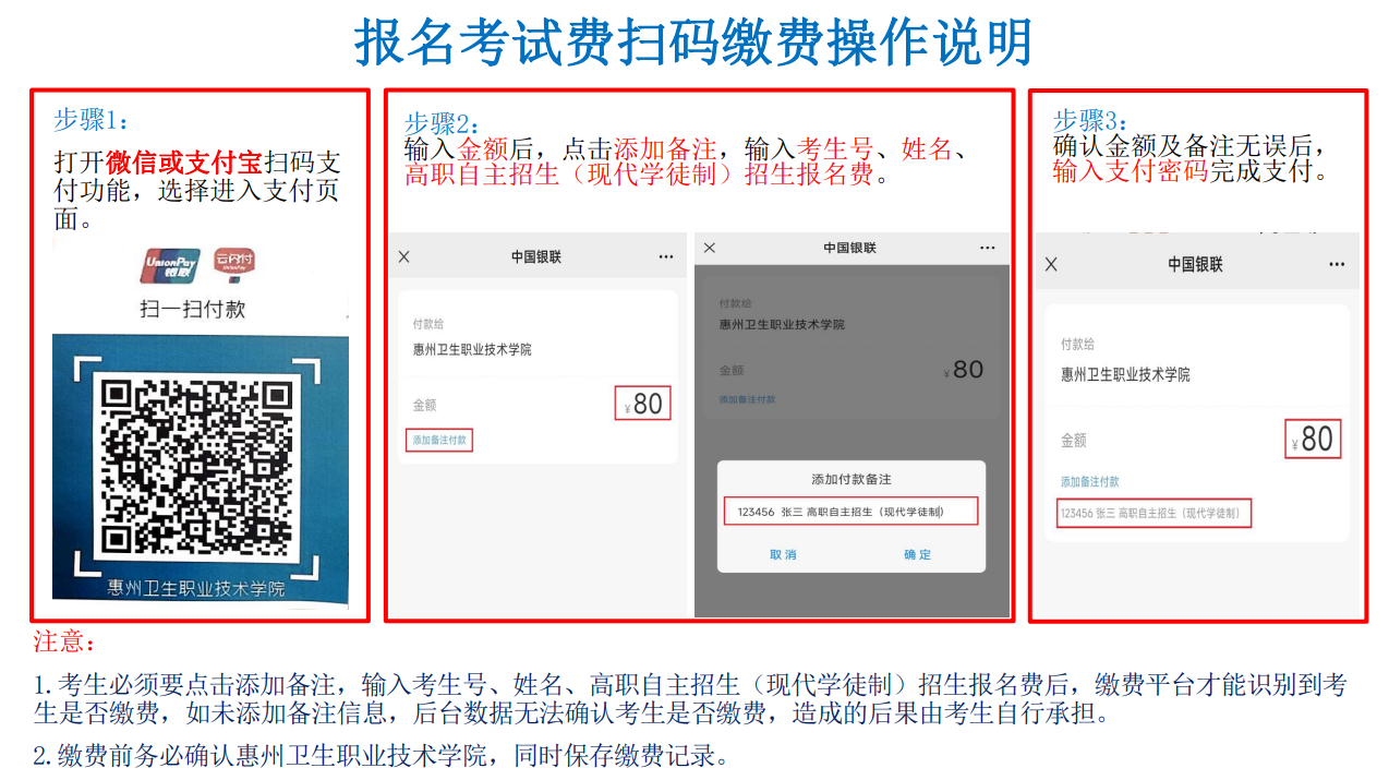 报名考试费缴交采用二维码收取,请考生在缴费时备注考生号、姓名,用途写高职自主招生(现代学徒制)。