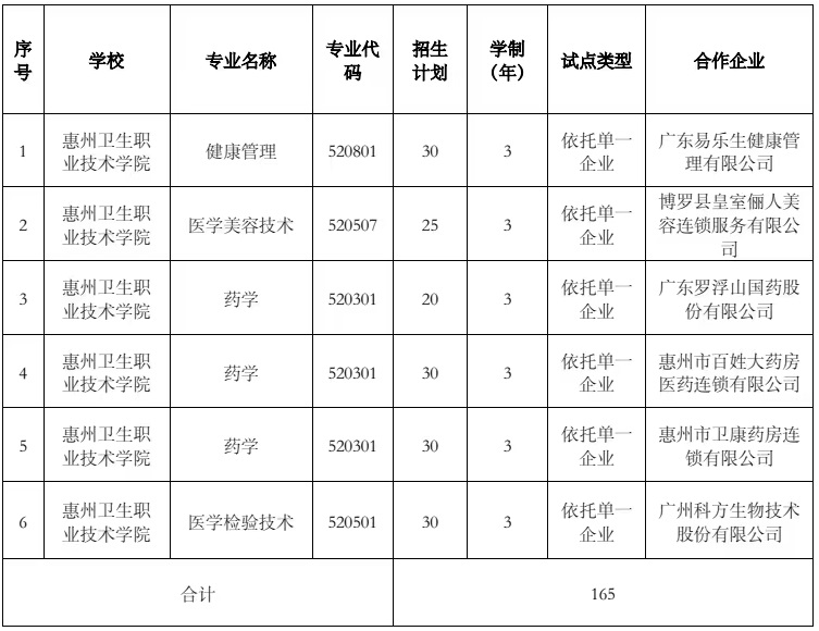 我校2022年自主招生(现代学徒制)试点招生计划为165人,试点专业为健康管理、医学美容技术、药学、医学检验技术4个专业,试点合作企业为广东易乐生健康管理有限公司、博罗县皇室俪人美容连锁服务有限公司、广东罗浮山国药股份有限公司、惠州市百姓大药房医药连锁有限公司、惠州市卫康药房连锁有限公司、广州科方生物技术股份有限公司。