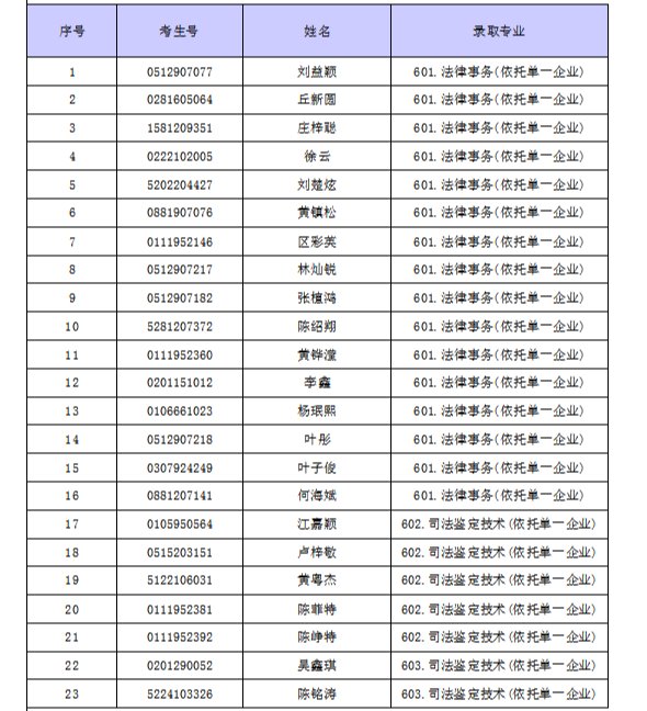 根据广东省教育厅关于做好2023年高等职业院校自主招生工作的通知(粤教考函〔2023〕13号)精神及广东司法警官职业学院2023年普通现代学徒制试点招生简章的有关规定,在招生计划内,按照录取规则各专业符合录取资格的考生从高分到低分择优录取,经广东省教育考试院审核通过,我校2023年自主招生考试录取考生23名,各专业的具体录取名单公布如下: