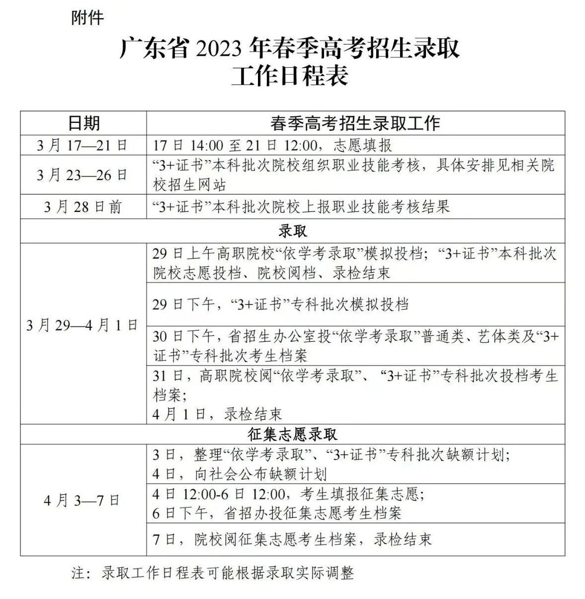 春季高考招生录取时间为3月29日至4月7日,详见《广东省2023年春季高考招生录取工作日程表》(附件)。