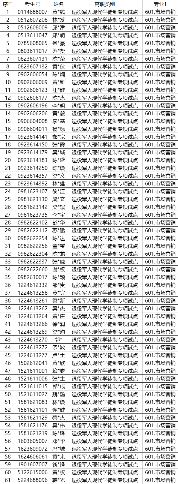 根据《关于做好2024年高等职业院校自主招生工作的通知》(粤教考〔2024〕4号)文件精神,结合广东省教育考试院工作安排,我校完成2024年退役军人现代学徒制试点考生报名材料审核工作,共有61人通过审核,符合试点报名条件,获得我校2024年退役军人现代学徒制试点校考资格,现就详细名单公布如下。