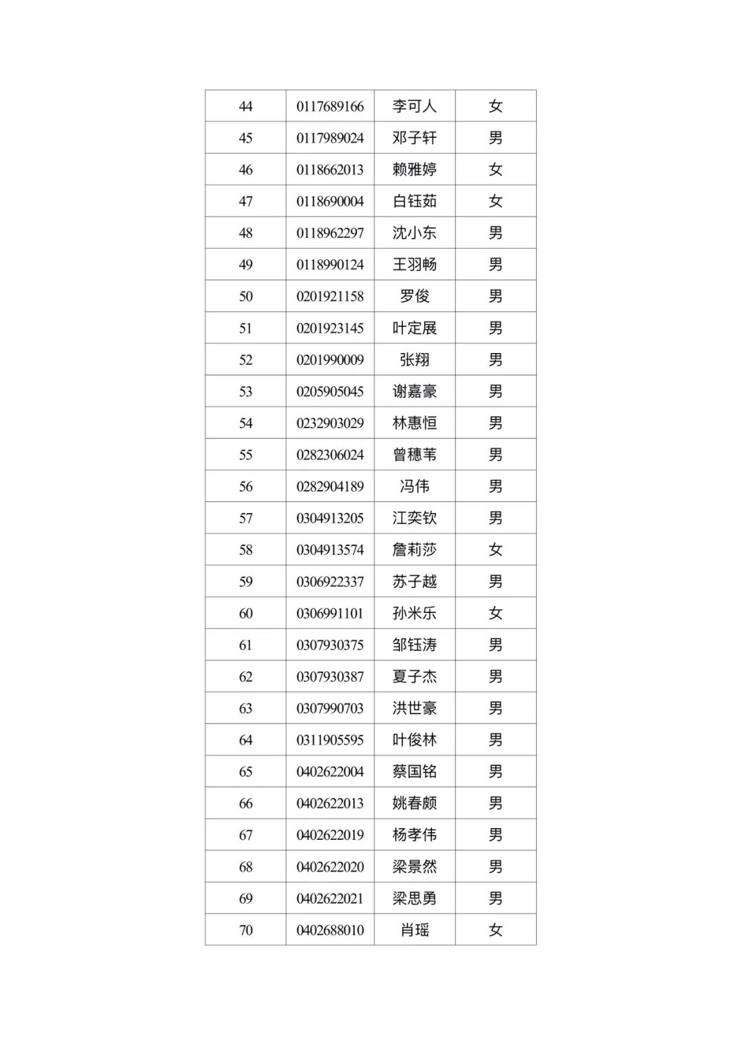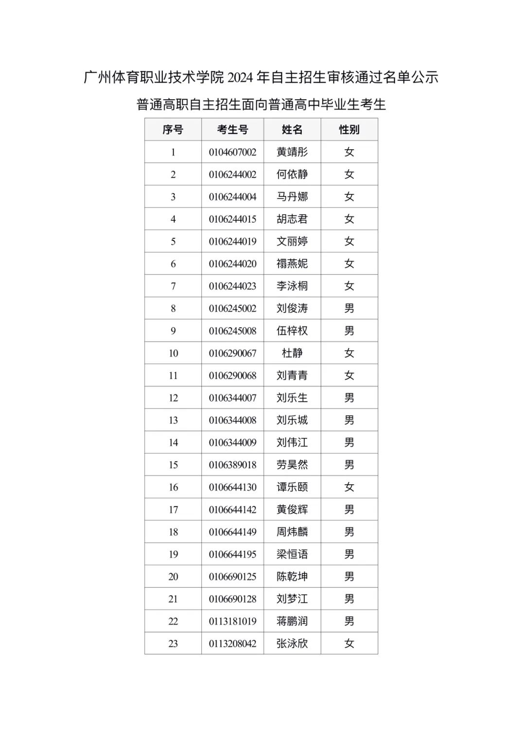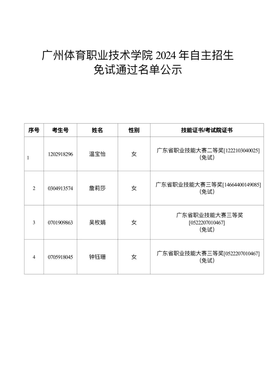 附件2:广州体育职业技术学院2024年自主招生免试通过名单公示 广州体育职业技术学院招生办2024年5月13日