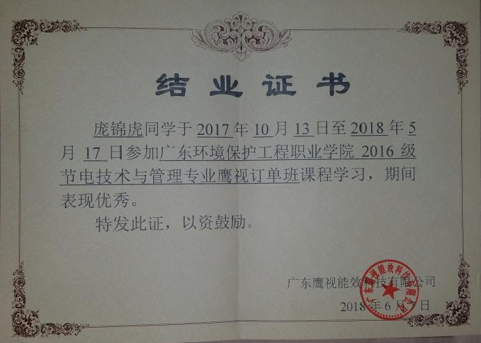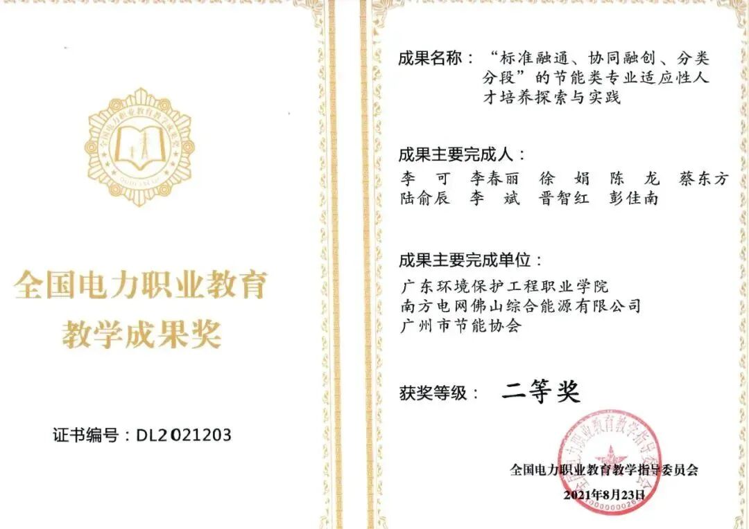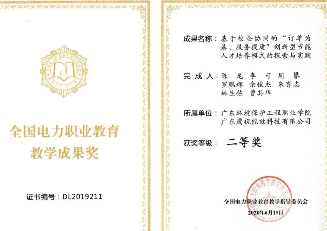 广东鹰视能效科技有限公司节能类专业大学生校外实践教学基地、能源与节能实训基地被分别认定为2018年广东省高职教育大学生校外实践教学基地、校内实践教学基地;广东省高职教育“节能类专业公共实训中心”2019年被教育部认定为国家级生产性实训基地;探索实施精准对接、精准育人的“特色订单班”人才培养模式,订单班的品牌效应不断提升,我们已经和广东鹰视能效科技有限公司开展校企合作连续开设了五届节电技术与管理专业鹰视订单班。并且主持获得了教育部2019年和2021年全国电力职业教育教学成果二等奖2项。