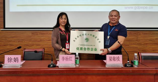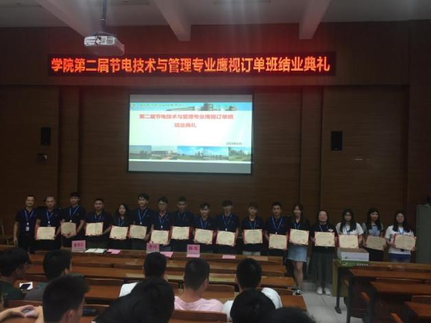 秦育宣经理颁发结业证书,学院李杨红副书记给企业授牌。订单班的品牌效应不断提升,我们已经和广东鹰视能效科技有限公司开展校企合作连续开设了五届节电技术与管理专业鹰视订单班。