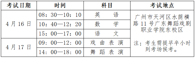 2、术科考试合格名单公布:4月下旬于广东舞蹈戏剧职业学院招生信息网、“广舞戏招生就业处”微信公众号公布;