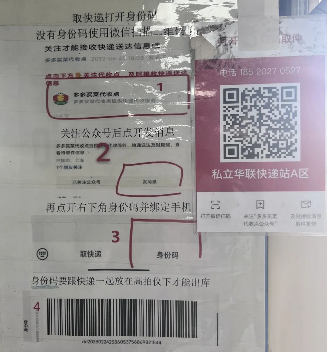 关注微信公众号“多多买菜代收点”通过绑定自己手机号,快递到了公众号就会给你发取件🐎,然后到快递站根据取件码拿快递,再用身份码扫描出库即可