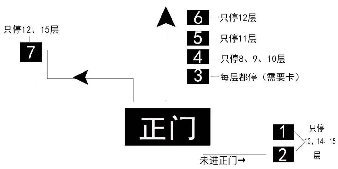 学校大部分课程都在教学楼进行,而人数较多,教学楼的电梯并不是每层都停,所以一般会出现上下课电梯拥挤,在此放上教学楼电梯略图,可做参考,方便同学们上课(请提前出门等待电梯,避免上课迟到)