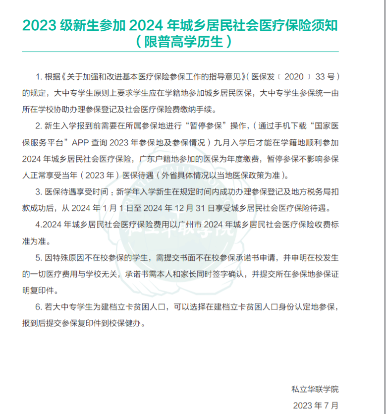 私立华联学院位于广州市中心天河区,大学三年都在广州市区就读。请您按《录取通知书》指定的时间到校报到,切勿提前或推迟(特殊情况除外),如确实不能如期报到的,必须在 2023 年 09 月 06 日之前将请假原因、拟报到时间,考生签名等以书面形式邮寄或拍照等方式向我校招生办请假,并打招生办电话(020-82373721)确认。无特殊情况请假不得超过两星期。
