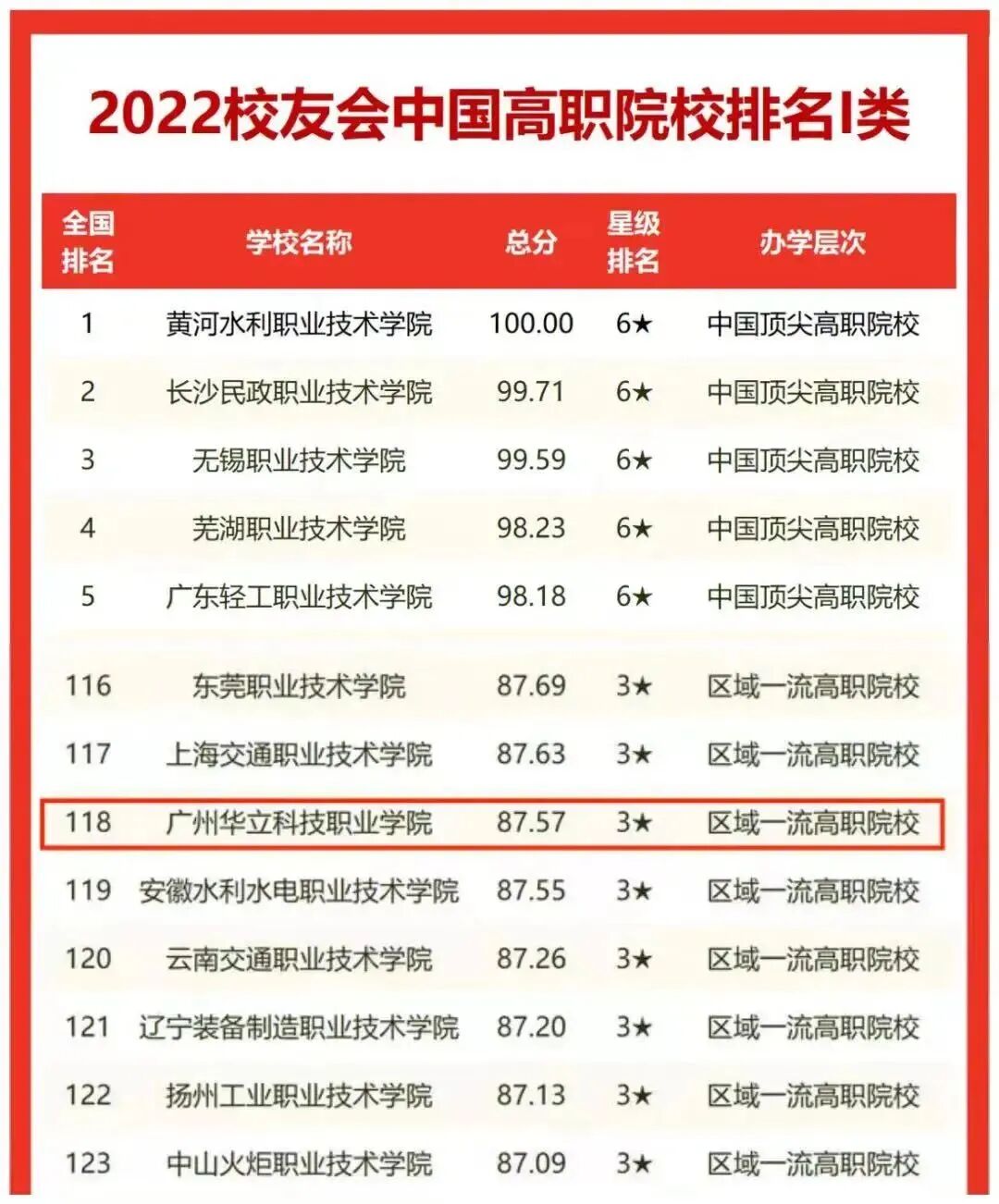 2022年校友会中国高职院校排名Ⅰ类(以工学门类学科专业为优势的院校),广东省96所高职院校,上榜院校共21所高校(其中公办18所,民办3所),我校位列全省第12名,在同类院校中排名第2名;在全省一类高职院校中誉为:区域一流高职院校。