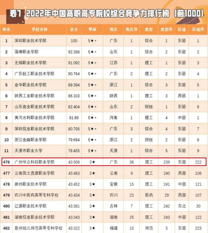 2022年“金平果排行榜”(中评榜)中国高职高专院校综合竞争力排行榜(1000强)中,我校在全国1484所高职中排名476名,广东省第36名,广东民办高职院校中排名第3。