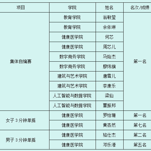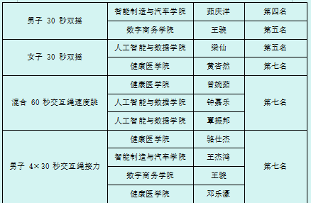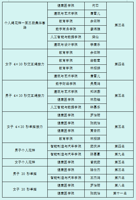 跳绳队:团体总分一等奖(11金、11银、13铜)