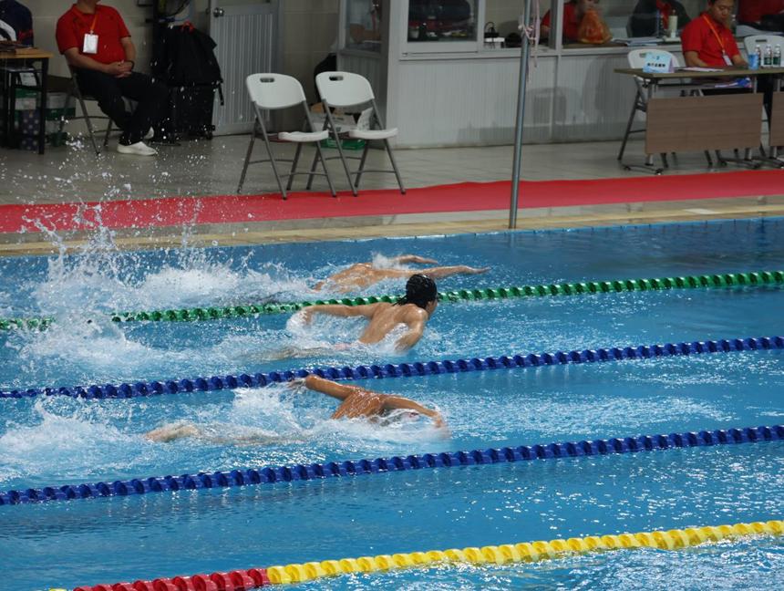 校泳队张钧浩(中间)正在参加50米蝶泳决赛