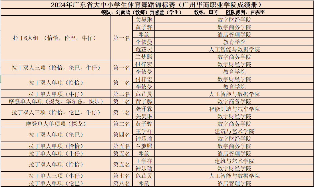 11月8日至10日,2024年广东省大中小学生体育舞蹈锦标赛在广东外语外贸大学圆满落下帷幕。广州华商职业学院体育舞蹈队在这场全省95所学校、超1000多名运动员参与的激烈角逐中,以卓越的表现获得团体总分一等奖的优异成绩。他们参加了女子单人、男女双人以及集体六人组项目,舞种涵盖拉丁舞的恰恰、伦巴、牛仔舞,以及摩登舞的探戈、华尔兹、快步舞。
