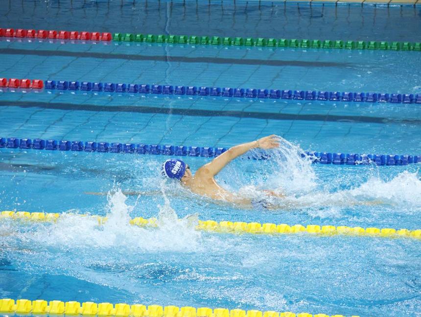 校泳队呼延浩正在参加100米自由泳决赛