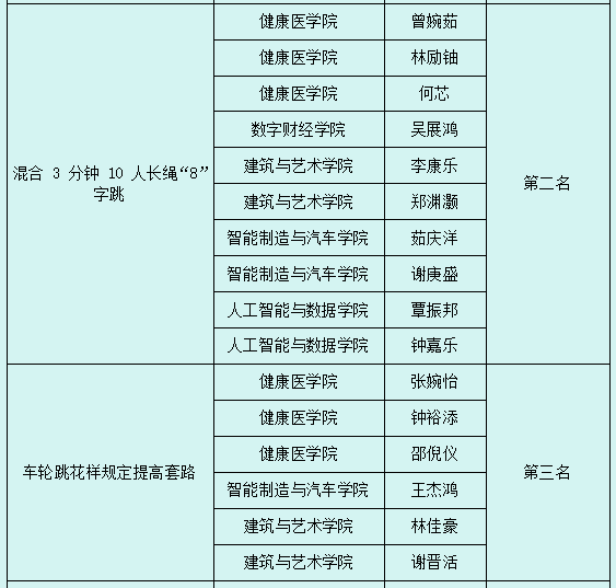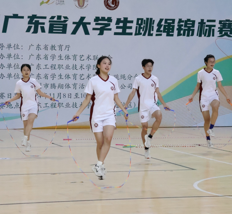 11月8日至10日,由广东省教育厅指导、广东省学生体育艺术联合会主办的2024年广东省大学生跳绳锦标赛在广东工程职业技术学院(清远校区)隆重举行。广州华商职业学院跳绳代表队积极参赛,共派出31名学生参加个人赛4项及集体赛7项等多个项目的激烈角逐。在甲组和丙组并组的情况下,华商职院学子顶住压力,顽强拼搏,最终斩获11金、11银、13铜的优异成绩,并荣获丙组团体总分一等奖。