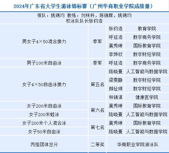 11月9日,2024年广东省大学生游泳锦标赛在华南师范大学(大学城校区游泳馆)隆重开幕。此次大赛吸引了75所高校1050多名游泳选手的参与,人数创新高,竞争尤为激烈。广州华商职业学院泳队凭借着顽强的毅力和出色的实力,取得了团体总分二等奖的优异成绩。