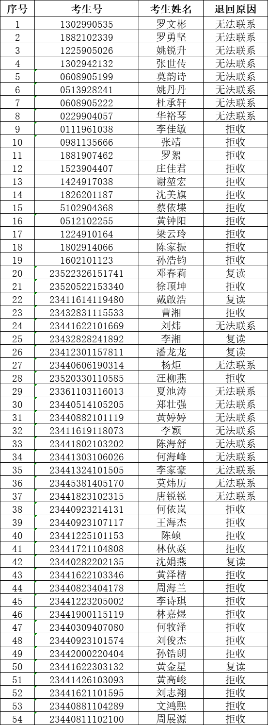 由于无法与收件人取得联系、考生复读等原因,下列2023级新生的录取通知书被退回我校(数据信息采集时间截至2023年9月3日)。下列新生看到本通知后,如需重新寄发录取通知书,请及时与学校招生就业处联系(联系电话:0763-3918200)。