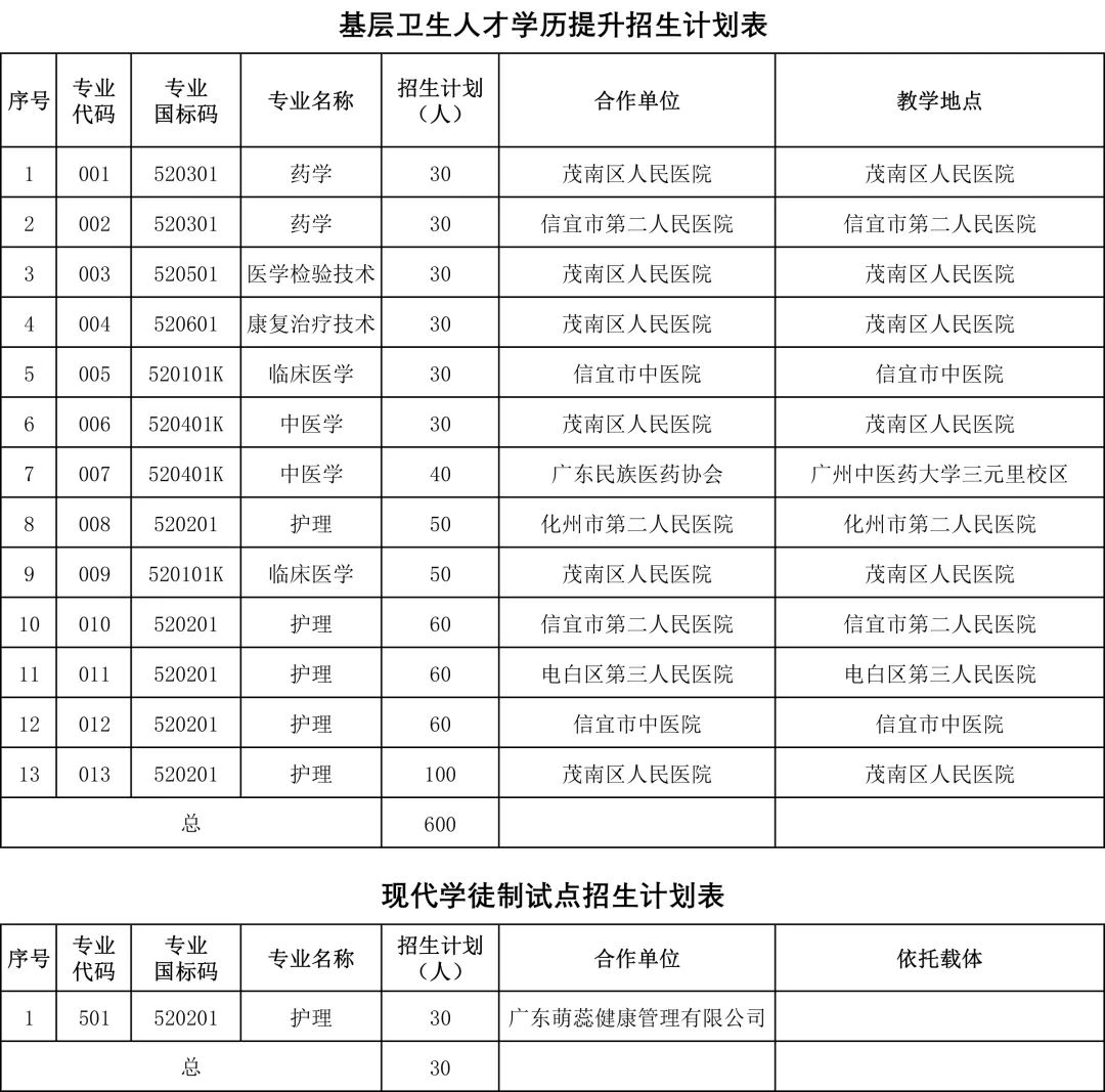 广东茂名健康职业学院是经广东省人民政府批准、教育部备案的公办全日制普通高等职业学校。现有临床医学、护理、药学、医学技术和健康管理与促进等5个系,开设临床医学、针灸推拿、中医学、护理、助产、药学、中药学、中药材生产与加工、食品质量与安全、市场营销、医学营养、健康管理、医学检验技术、眼视光技术、卫生信息管理、康复治疗技术、医学美容技术、中医养生保健、智慧健康养老服务与管理、现代家政服务与管理等20个专业,其中临床医学、针灸推拿、中医学为国控专业。