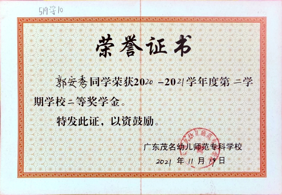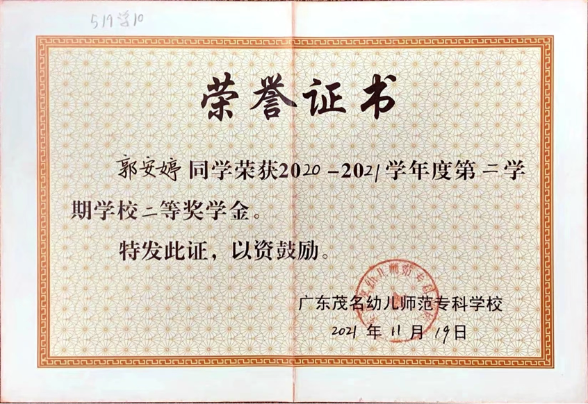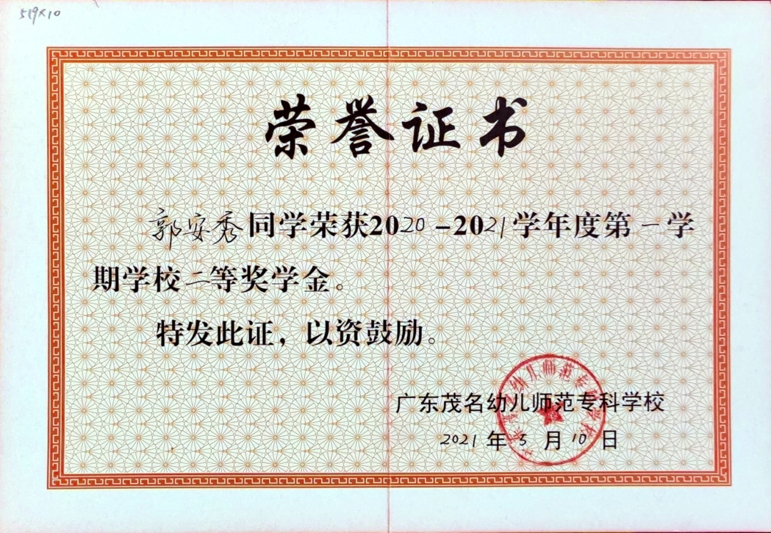 2020-2021学年获得校二等奖学金并被评为“三好学生”;