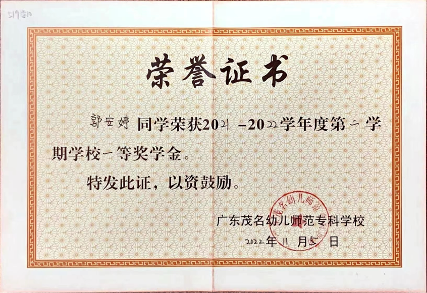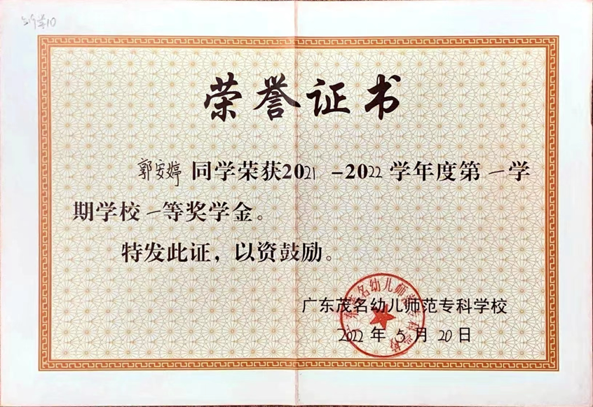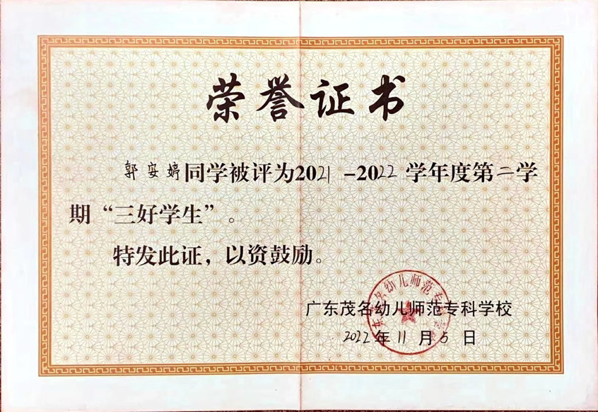 2021-2022学年获得校一等奖学金并被评为“三好学生”;