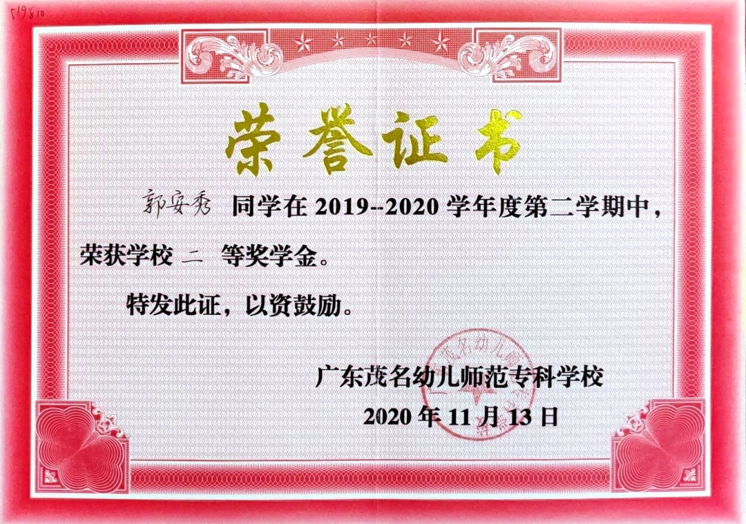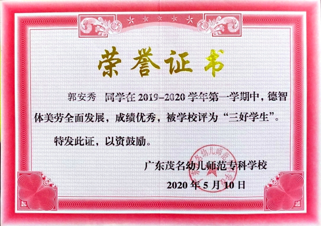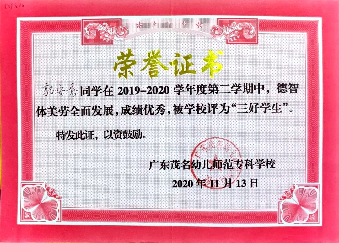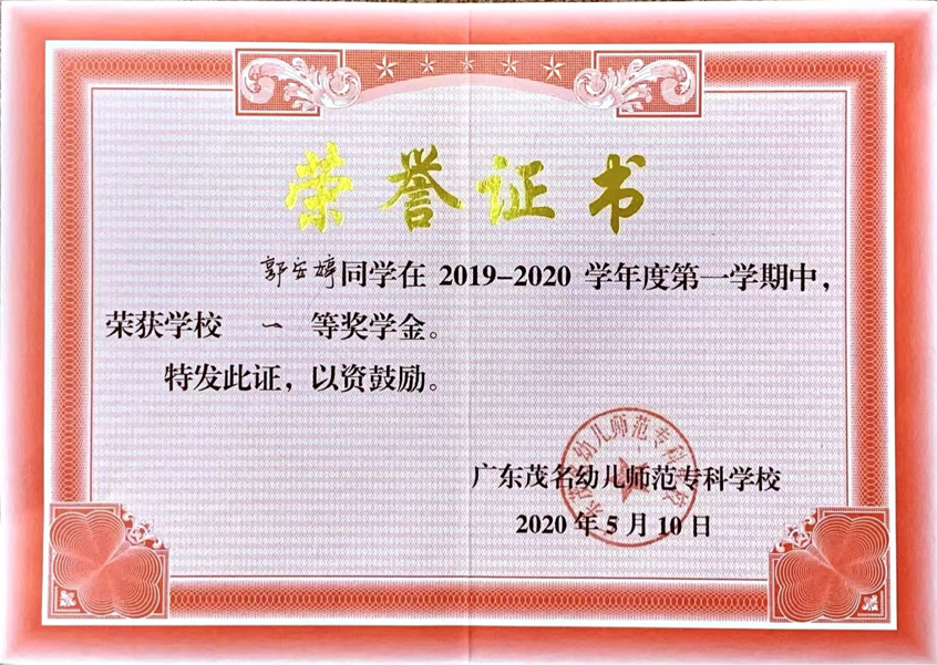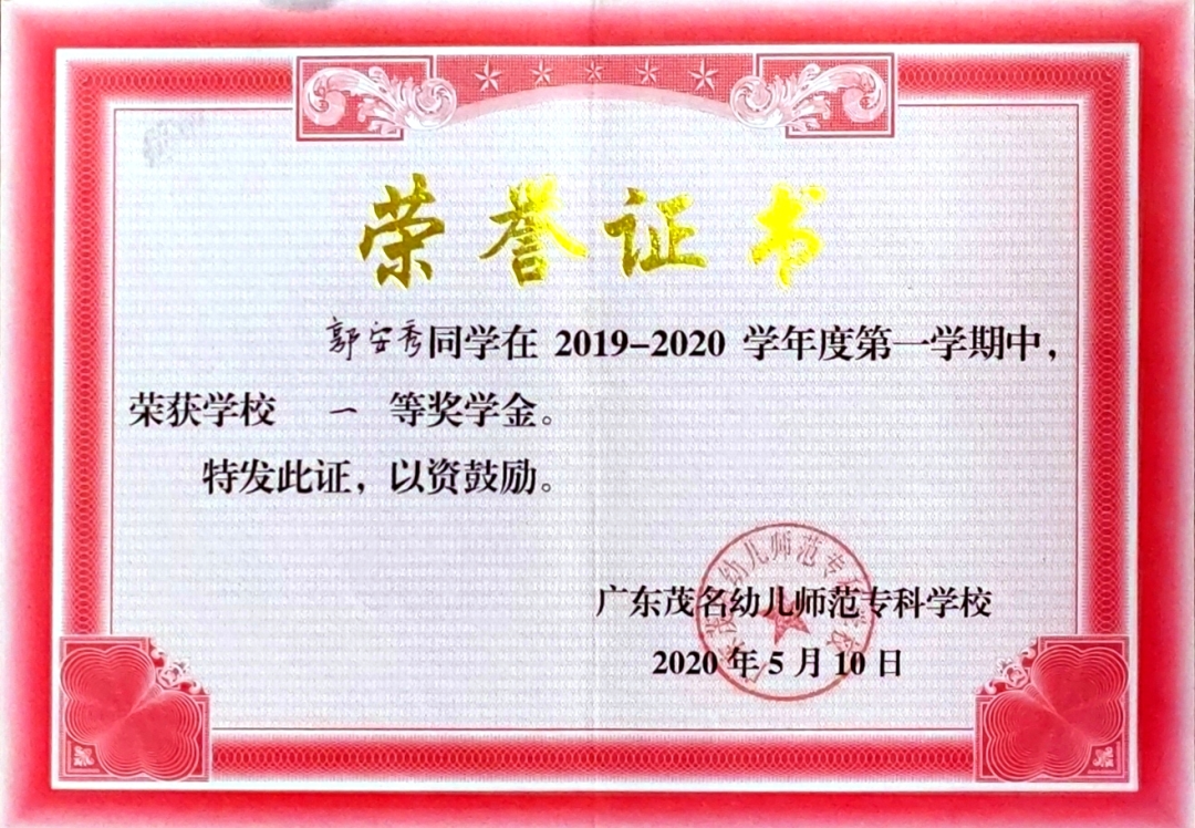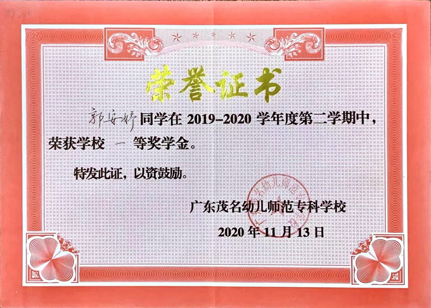 2019-2020学年获得校一等奖学金并被评为“三好学生”;